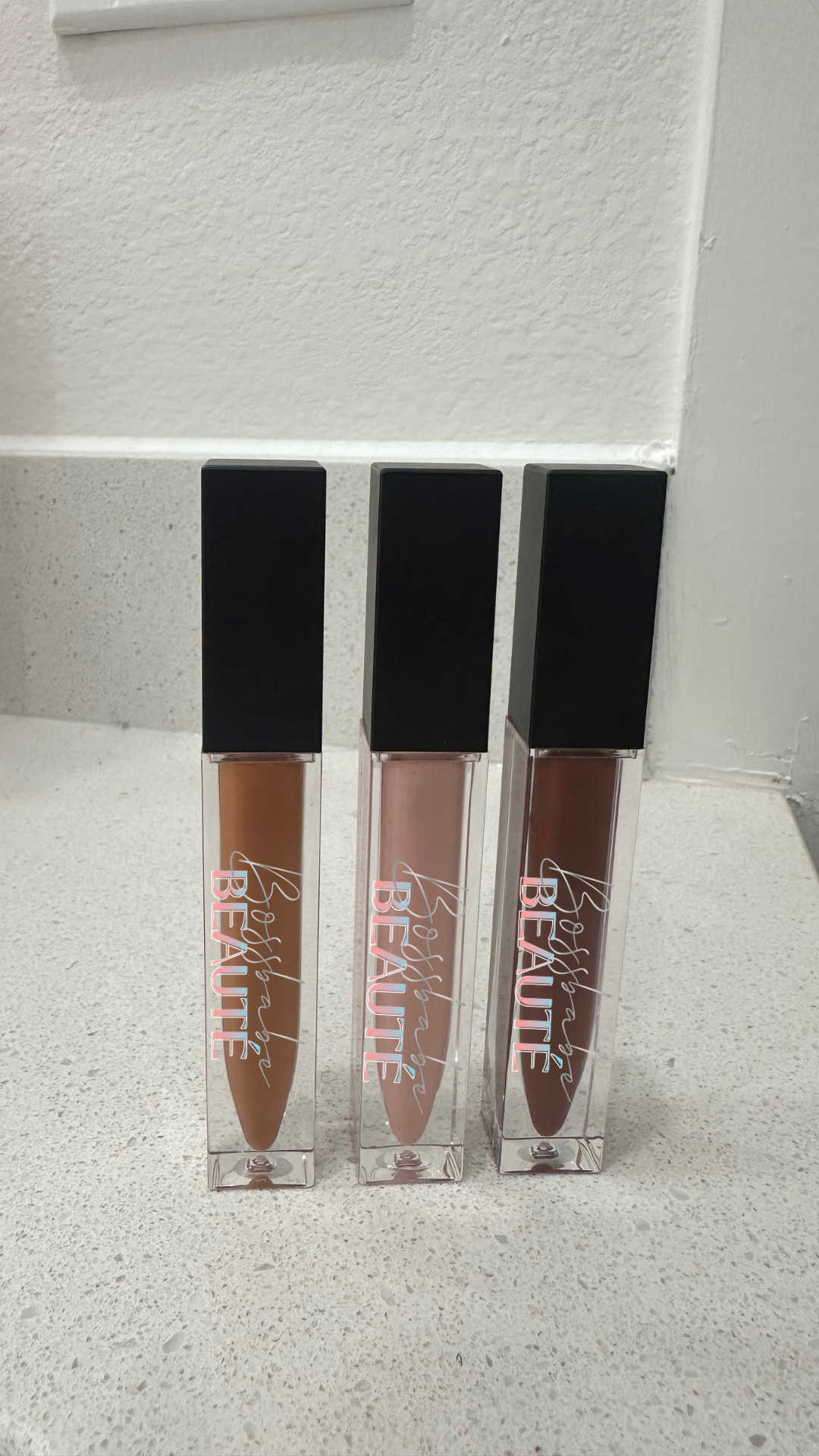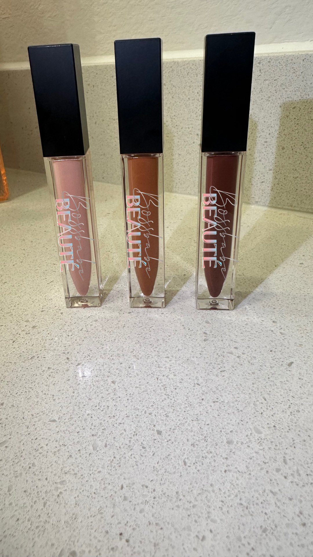 Fairy dust (light pink gloss), karma (tan/nude gloss) and Hershe (brown mixed maroon gloss)